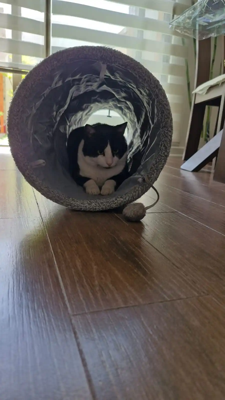 The play tunnel equipped hanging ball at the entrance add more way to have fun that brings hours and hours exercise and self-amusement as bating and swatting. A solid sprung steel frame with protective ends gives an added level of safety for your cats. It pops up in few seconds and folds down into a small item that is super easy to carry and storage.